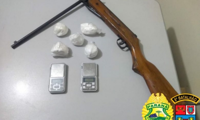 Ao realizarem buscas no local, os PM’s localizaram cinco invólucros de tamanho considerável com entorpecente, pesando aproximadamente 249 gramas de cocaína, duas balanças de precisão e uma espingarda de pressão, aparentando ser modificada para uma arma calibre 0.22.