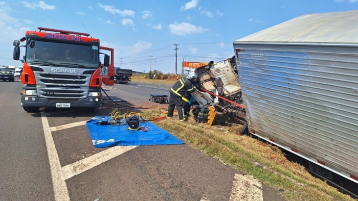 Caminhão tomba na BR-376 em Nova Esperança, motorista ficou preso às ferragens